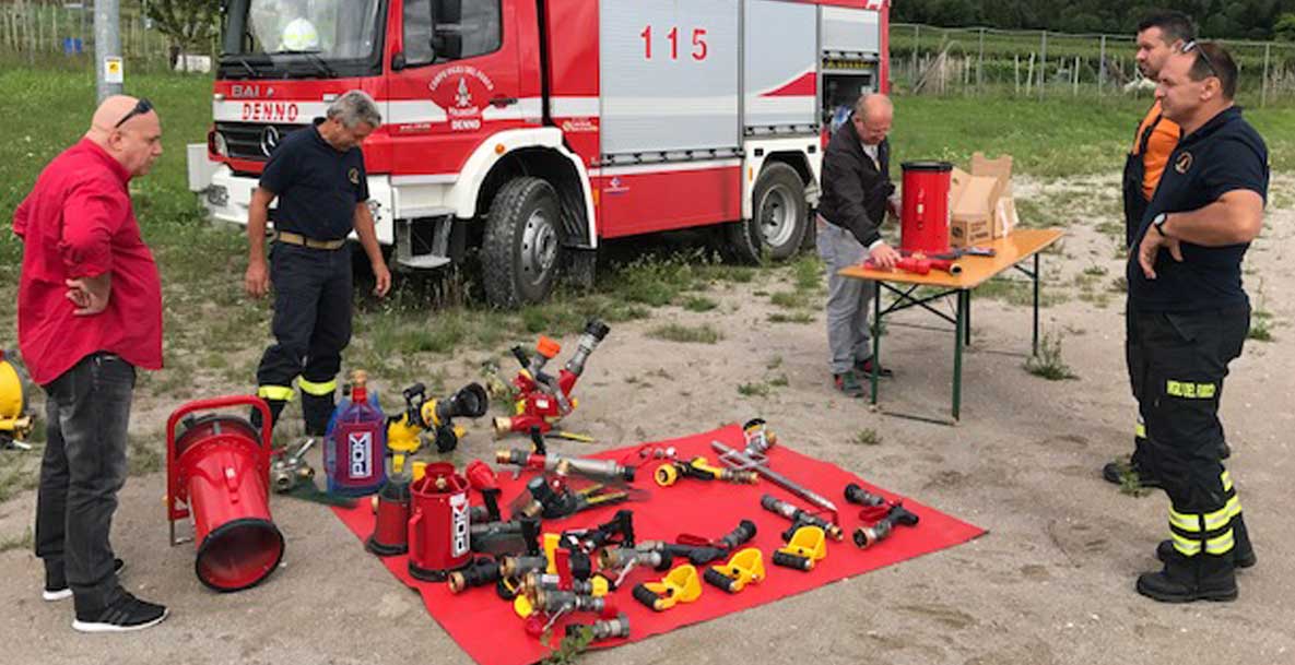 Cette journée s’est déroulée à Deno, à l’extrême nord de l’Italie, sur un site, d’entraînements et de démonstrations, équipé de cellules d’entraînement de feu en milieu clos. De 9 heures du matin à tôt dans la soirée, ce sont près de 70 pompiers qui sont venus sur ce site pour tester les produits POK dans des conditions réelles d’utilisation.